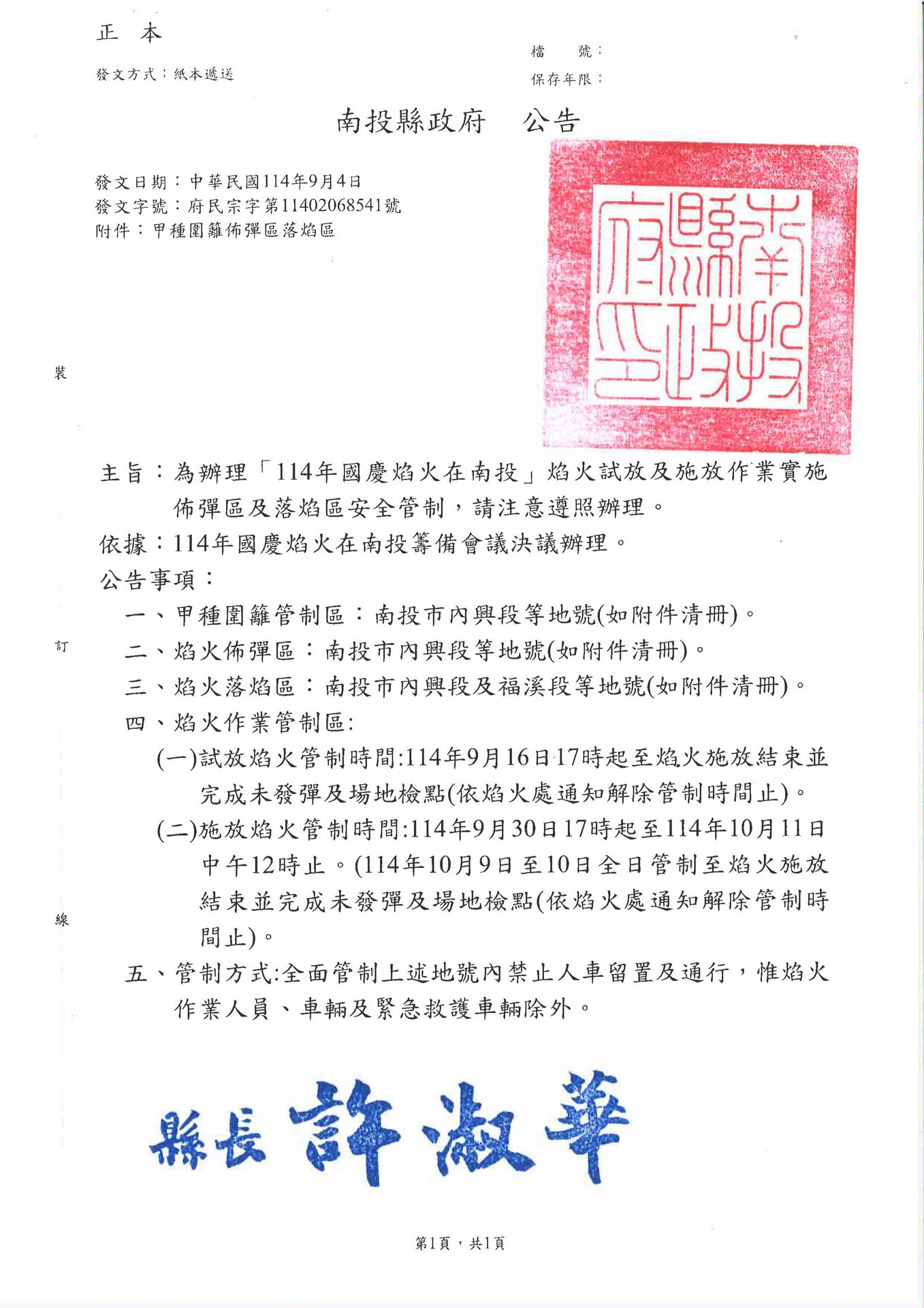 「114年國慶焰火在南投」焰火試放及施放作業實施佈彈區及落焰區安全管制