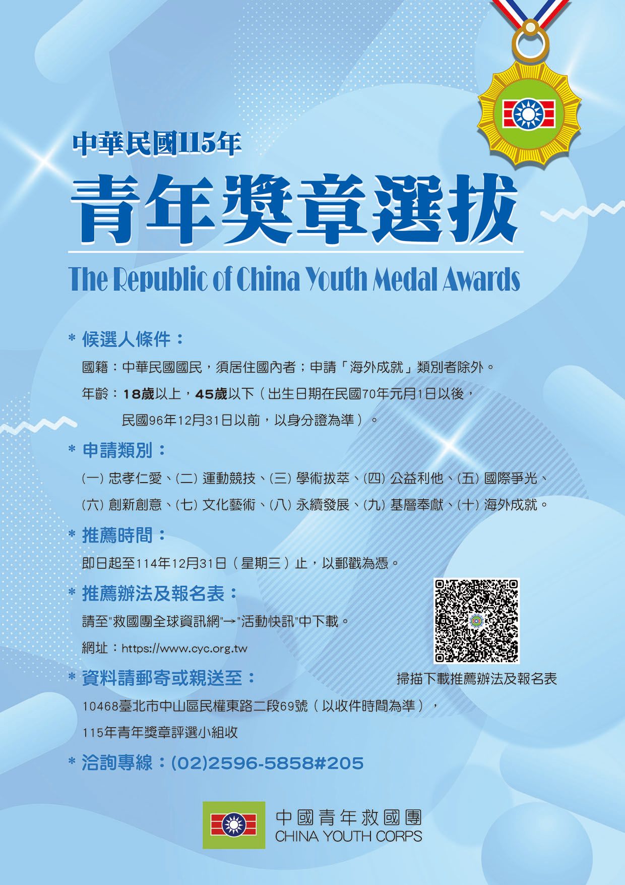 救國團為獎勵青年優良德行與傑出成就,並表揚青年對國家社會之重大貢獻,辦理115年青年獎章選拔。