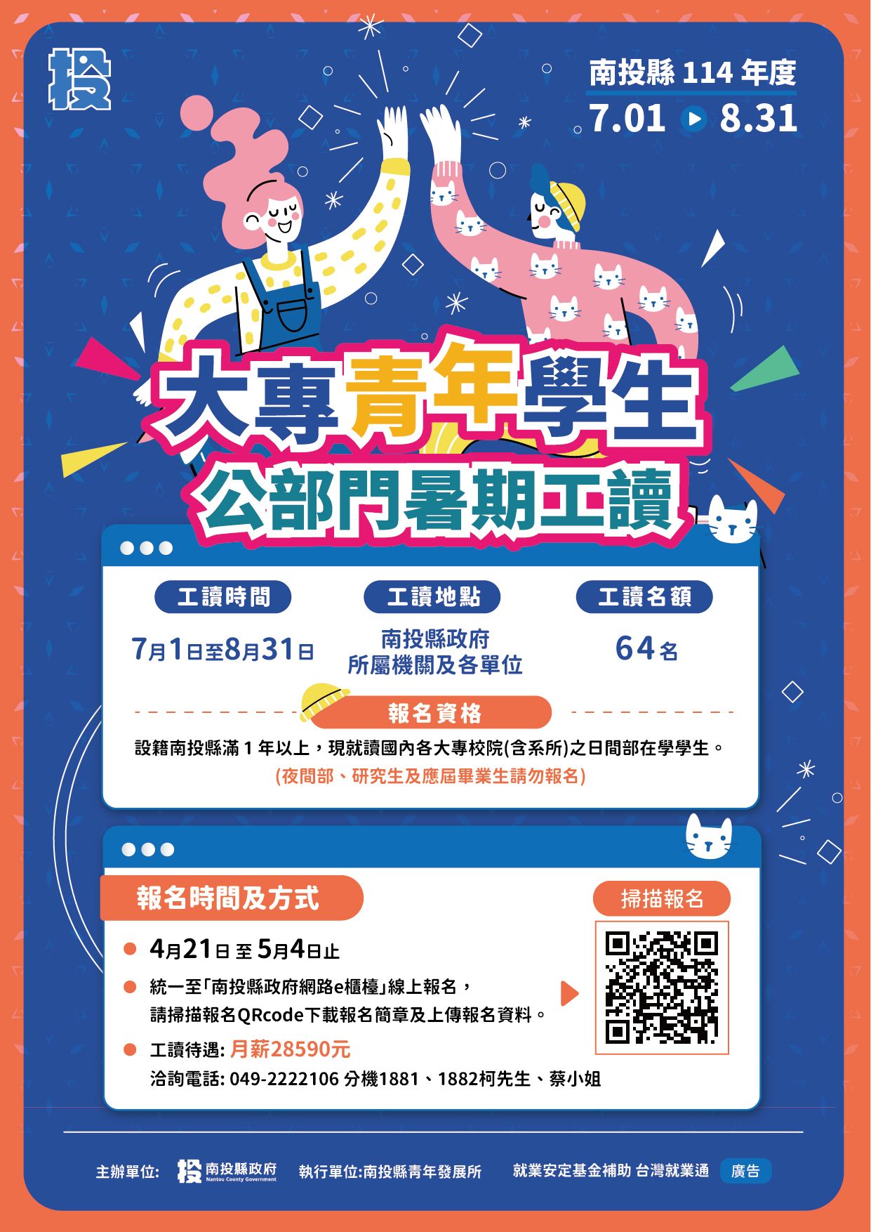 南投縣政府提供本縣大專青年學子在未來進入職場前能至公部門打工並累積職場經驗,規劃辦理114年度大專青年學生公部門暑期工讀計畫,提供64個工讀機會,本計畫適用對象為凡設籍本縣1年以上(以受理報名114年4月21日起算,亦即113年4月21日(含)以前設籍者),並就讀國內各大專院校具有學籍於修業年限內之學生,惟不包括五專前三年、空中大學及研究所在職專班學生、研究生、應屆畢業生、大學延畢生、夜校生、假日進修部學生。報名期限自114年4月21日起至5月4日止,未在期限內報名一律不受理,請符合上述資格的同學們,務必把握報名期限。